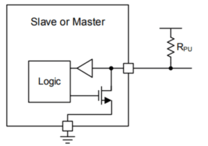 Gambar diatas menunjukan struktur internal dari perangkat I2C, didalamnya terdapat buffer untuk membaca data masuk, dan FET (Field Effect Transistor) untuk transmisi data, kita bisa membuat kondisi jalur menjadi LOW dengan memberikan arus pada Gate transistor, dengan begitu arus dari vcc akan terhubung ke Ground dan menyebabkan jalur menjadi LOW.
